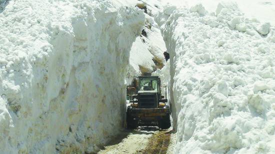 深达数米的积雪被铲土车推出一条路。刘强/摄