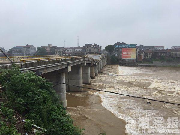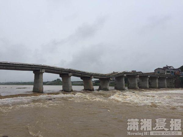 岳阳县公路局4日当天通过政府网站发布了一则公告。公告显示:6月4日凌晨5点,岳阳县公路局防汛值班电话接到报警,S306线筻口大桥出现险情。6点整,岳阳县公路局杨学军局长等一行第一时间赶到现场。经现场勘查,大桥6、7、8、9#桥墩下沉倾斜,桥面断裂,交通完全中断。随后,市县政府领导及市公路局长均已赶到事发地点,进行紧急部署,公安交警、公路路政等部门已对事发路段实行交通管制。事发原因正在调查之中,据初步分析,可能与近期上游(临湘市)持续暴雨天气引发洪水冲刷河床、桥墩基础掏空与下游河床降低有关。据初步排查,未引发交通事故,未造成人员伤亡。(潇湘晨报记者 曾永红 实习生 师飞)