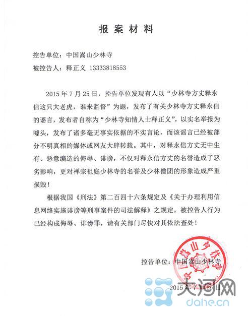 大河网记者随后与少林寺有关负责人沟通,确认该报案材料确为少林寺官方所发。