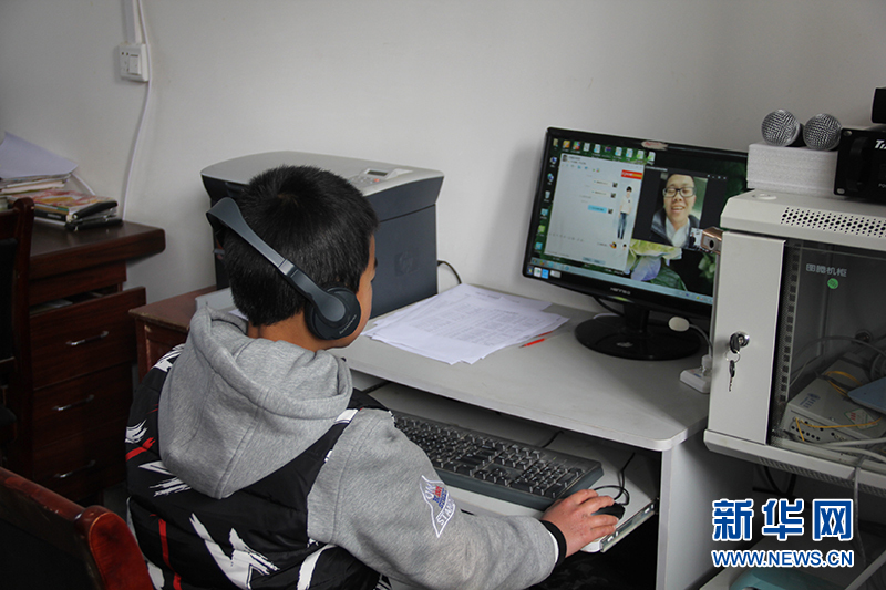 留守儿童吴畅在学校与在外打工的哥哥进行视频对话(闵任之 摄)