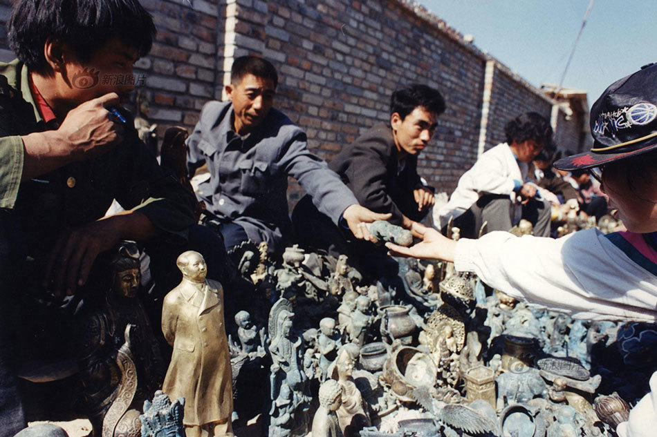 【假古董】假古董、假古玩,这些年也是见怪不怪了。在北京潘家园、天津沈阳道等古玩市场,能看到很多假古董。假古董也流入了收藏市场,有的人花几千万以为买下的是唐代的古玩,其实都是现代的高仿品。图为1995年,北京,旧货市场上卖假古董的人。供图/视觉中国