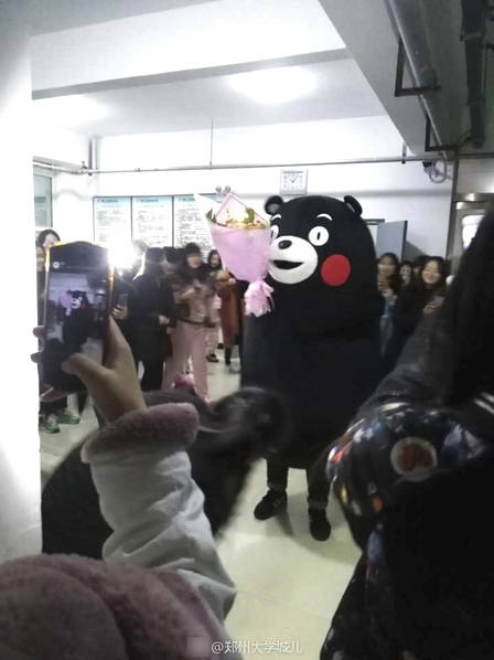 12月7日晚,在河南郑州新郑河南工业贸易职业学院,一男生扮成熊本模样手捧鲜花,在某女生宿舍楼下大喊“安红,我爱你”向女生告白,很长时间由于女生没出来,男生打听到女生宿舍号直接冲女生寝室,结果惨遭保安踹门驱离,告白失败。