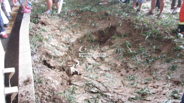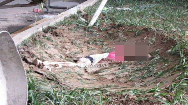 花坛的泥土中留下了一个人形的大坑和女青年的一只米色高根凉鞋(史忠树摄)