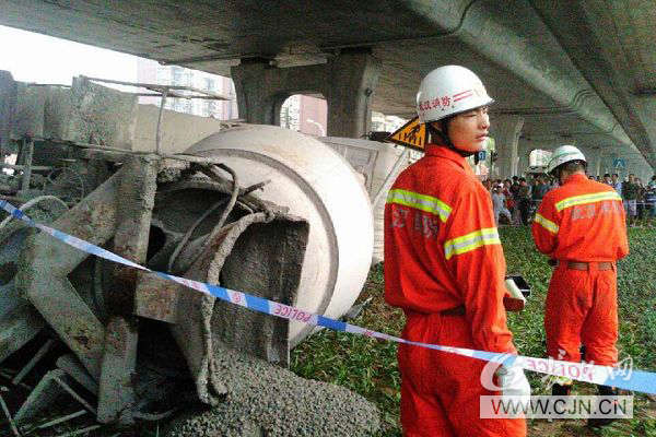 新闻记者10:05到达事故现场,只见水泥搅拌车侧翻在地上,交警、公安消防官兵和前来营救的三辆救护车以及两辆大吊车都已到达现场,周围围观的市民约200多人。