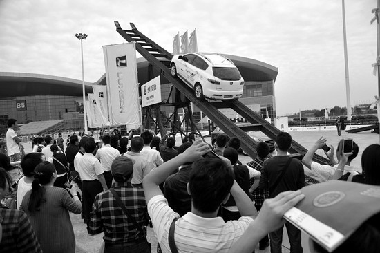 昨日上午,在A、B馆连接处,一辆白色的东风裕隆纳智捷,正沿着两块铁板缓缓开上60度的“巨型跷跷板”。记者发现,铁板两端并没有任何保护措施,汽车轮胎稍有偏差便会从十米高的高空掉下来。只见汽车缓缓驶向“巨型跷跷板”的中间,随着一阵刺耳的钢铁摩擦声,跷跷板缓缓倒向另一侧,这辆白色纳智捷才缓缓开下铁板。