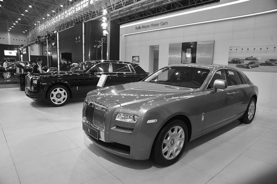 在B5展馆,一排红色的法拉利跑车异常亮眼。停在最外的法拉利加利福尼亚车型,售价352万元,吸引不少市民驻足观看。在另一端的劳斯莱斯展台上,停着一辆幻影和一辆古斯特。据了解,此次车展上,这辆劳斯莱斯幻影车价格最高,基础价格为600万元,如果增配零部件的话,价格则有可能达到千万元。