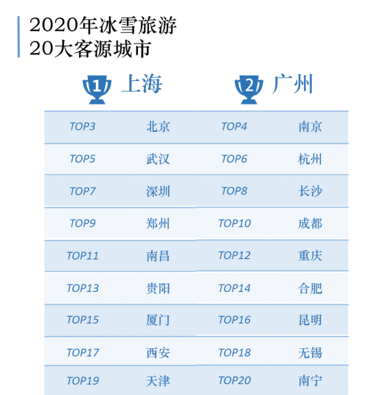 冰雪旅游对南方游客向来都有比较大的吸引力。数据显示,2020年,上海、广州、北京选择冰雪旅游的游客人数依旧位列前三,紧随其后的是南京和武汉。