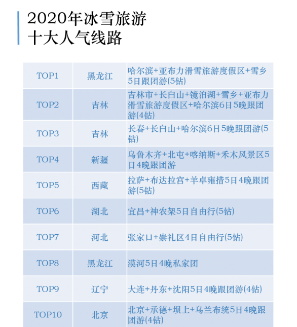 2020年热门的冰雪旅游路线,仍以东北为主,其中哈尔滨、亚布力和雪乡的线路再次受到游客认可。今年新疆、西藏、湖北的冰雪线路关注度明显提高。其中,湖北的“宜昌+神农架5日自由行”线路,在“2020年冰雪旅游十大人气线路”中排名第六。