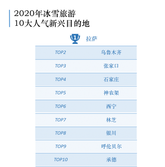 除了传统的冰雪旅游目的地,2020年冰雪旅游人气新兴目的地排名前十的分别是拉萨、乌鲁木齐、张家口、石家庄、神农架、西宁、林芝、银川、呼伦贝尔和承德。